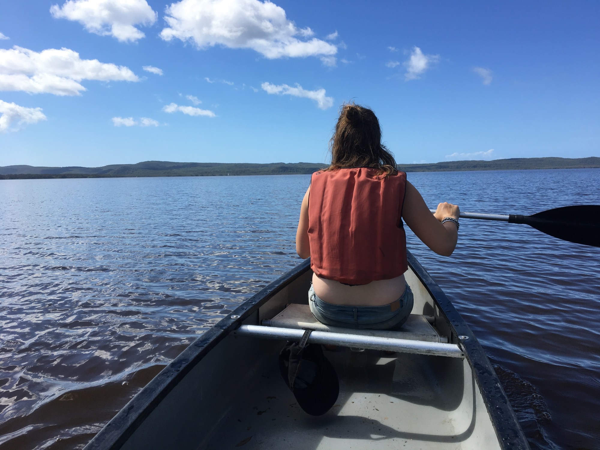 Al snel bleek dat met zijn tweeën peddelen een soort teamwork vereist dat we nog niet echt onder de knie hadden. Na heel wat beschuldigingen heen en weer over wie het hardst en best peddelde kwamen we uiteindelijk in een soort van ritme dat we beide oke vonden. Het water was niet diep en in het meer konden we (mochten we omslaan) eigenlijk overal staan. Midden op het meer hebben we een tijdje stil gelegen om te genieten van de stilte en van alle vogels die heel dichtbij voorbij vlogen. Het was alsof ze ons totaal niet doorhadden, we zagen pelikanen voorbij zwemmen en vliegen, zwaluwen raakte op een haar na onze boot en talloze andere vogels kwamen voorbij.